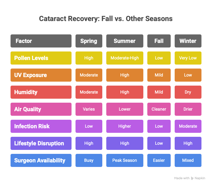 When we study recovery after cataract surgery in the fall, we find multiple advantages: fewer allergens in the air, milder temperatures, and better ability to protect your eyes without extreme adjustments. These stack up.