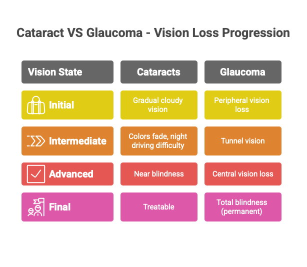 Vision loss from cataracts is usually reversible with surgery. Vision loss from glaucoma is generally permanent, as it involves damage to the optic nerve that cannot be repaired.